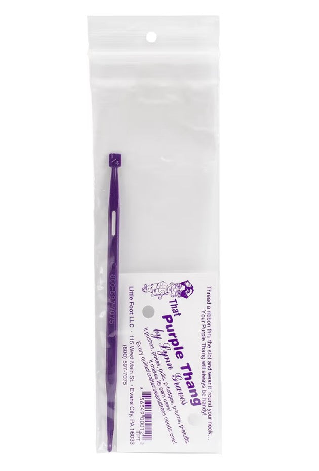 The Original Purple Thang, designed by Lynn Graves. Perfect for easing tricky point under your presser foot, or turning pesky corners right side out! It pushes, pokes, pulls, p-fudgest, p-turns, p-stuffs. It makes its own uses. Every quilter/crafter/sewist needs this versatile tool! Measures at approximately 6 inches long